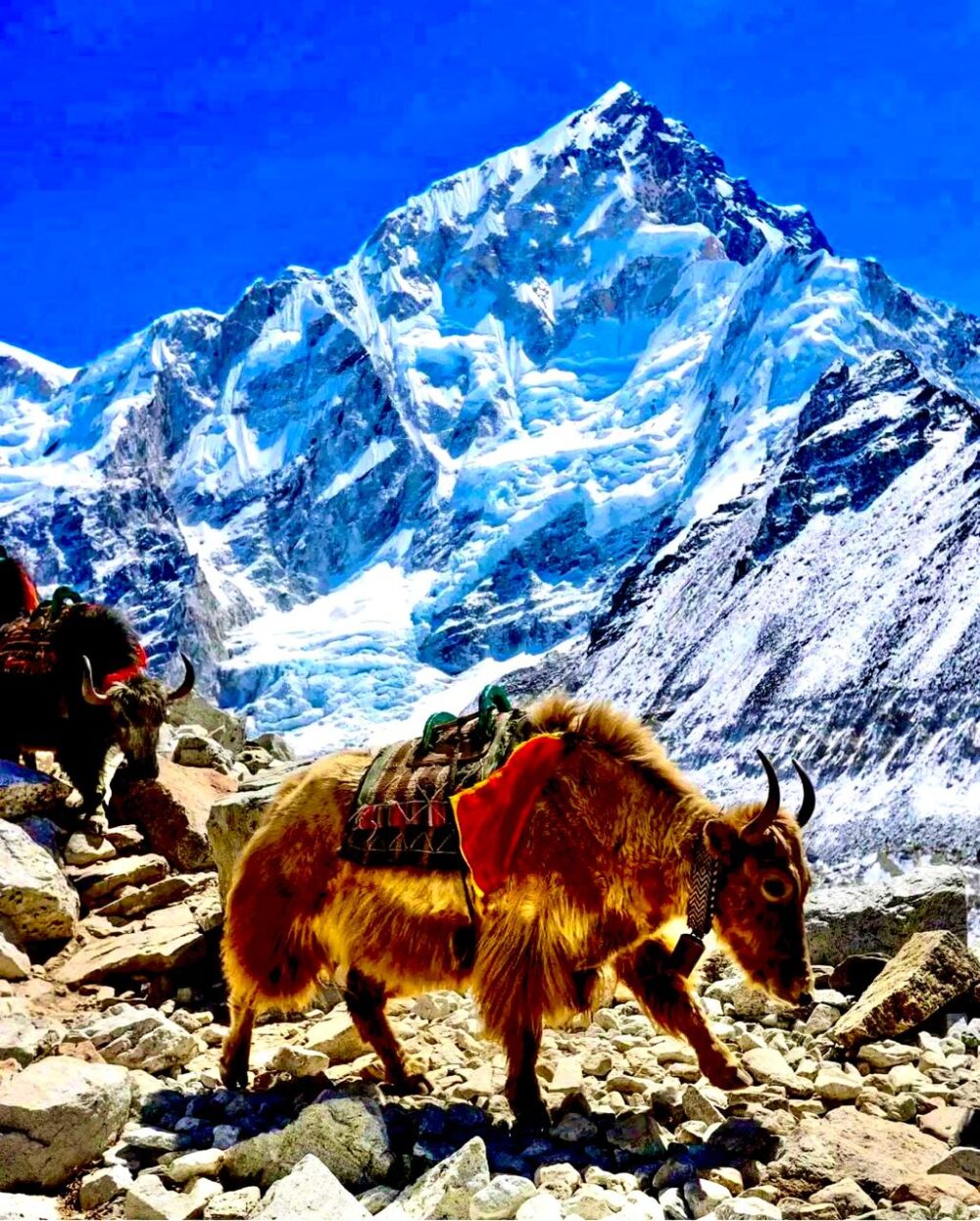 We begin today’s trek very early in the morning to reach the highest part of the entire trip which is Kongma La pass. We can either take a trail over a hill which is to the northwest of Chhukung over the Nuptse Glacier moraines or we can walk back to Bibre and trek on the trail above the Niyang Khola. The top of the pass is marked by cairns and Buddhist prayer flags. The final descent from the pass is the most difficult part of today’s journey. After climbing the moraine on the far side, the trail turns north through Khumbu Glacier which takes us to Lobuche. Overnight at Lobuche.